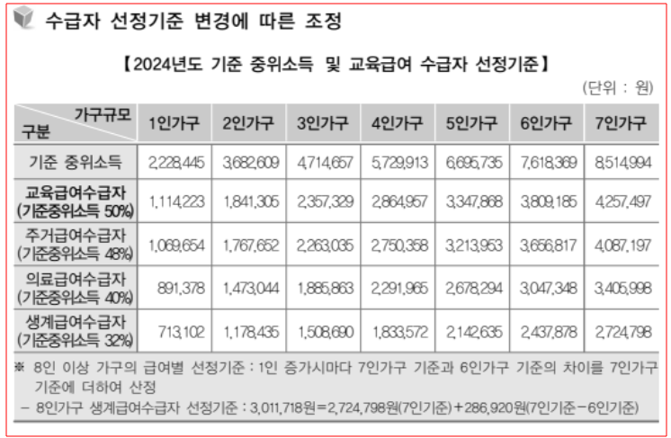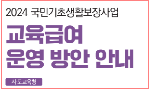 소득인정액이 기준중위소득의 50% 이하인 가구의 초. 중. 고등학생을 지원하며 교육급여는 부양의무자 기중을 적용하지 않습니다