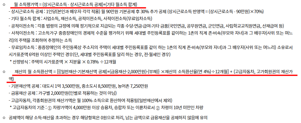 ③ 재산의 월소득 환산액: [{(일반재산-기본재산액공제)+(금융재산-2000만 원)-(부채)}x재산의 소득환산율(연 4%)÷12개월]+(고급자동차, 고가회원권의 재산가액)