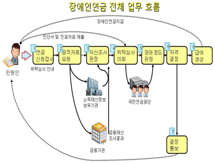 장애인신청 및 지급은 신창> 자산조사> 장애등급심사> 지급결정> 결과통지 및 지급으로 진행됩니다.