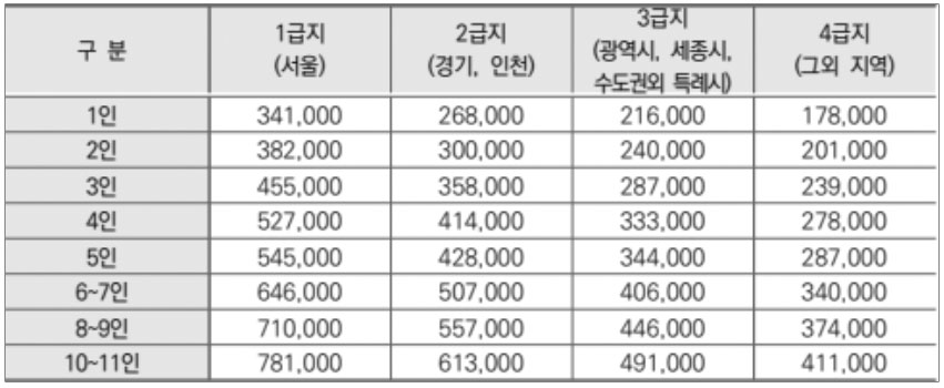 - 임차가구는 지역 및 가족수에 따라 산정한 기준임대료를 상한으로 실제임차료(월임차료+보증금환산액)을지원합니다.
